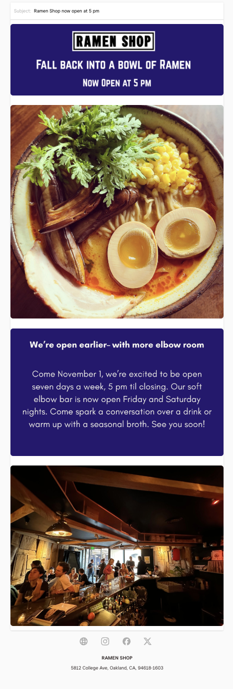 Ramen Shop wanted emails featuring graphics with a clear call to action. I crafted clear, colorful emails with a focus on raising awareness on upcoming events, partnerships, and chef spotlights.